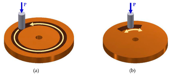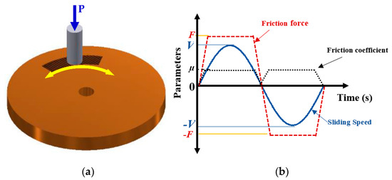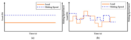 The efficacy of degradation coefficient in characterizing adhesive-type wear for a tribo-pair (i) sliding in uni- or bidirectional motions, (ii) operating in uniform or varying operating conditions, and (iii) transient wear conditions will be discussed in this section. Figure 6a,b display uni- and bidirectional motions in the rotating sliding condition. During variable operating conditions, the load or speed or both can change. Figure 7 shows an example of arbitrary varying loads and sliding speeds.