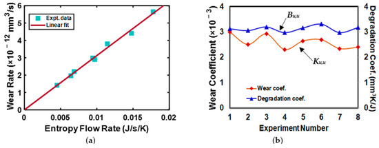 Considering the hardened steel 4140 and brass 360 tribo-pair in a ring-on-ring configuration under dry adhesive wear sliding conditions, Aghdam and Khonsari [123] performed an experimental validation of the thermodynamic principle. For a specific sliding regime, they observed that the degradation of the tribo-pair measured by wear rate was proportional to the power and entropy generation. Thus, they also concluded that the wear of the sliding system could be correlated to entropy generation through the degradation coefficient. To provide a clear understanding of their observation, the experimental data [95] along with the linear fit values for entropy generation for a series of measured wear rate values are plotted in Figure 9a. From this figure, it can be inferred that there exists an excellent linear correlation between the wear rate and entropy generation. Aghdam and Khonsari [123] concluded that irreversible thermodynamics is a promising tool for characterizing the wearing of tribo-pairs.