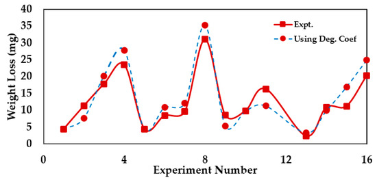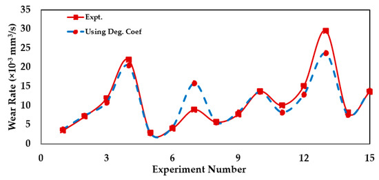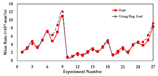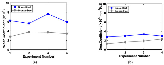 In 2008, Bryant and Khonsari [126] provided correlations for dry sliding wear and entropy flow through a degradation coefficient. They determined the degradation coefficient (via Equation (15)) using the friction coefficient, temperature, and wear rate and obtained a wear coefficient using Equation (16). The slope of the wear−entropy results is precisely the degradation coefficient, B, as predicted by the DEG theorem.