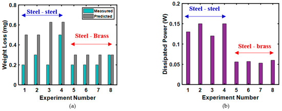 Brahmeshwarkar [83], in 2006, developed an experimentally verified correlation between wear and entropy flow in a tribo-pair operating in a unidirectional sliding motion with uniform/fixed operating conditions. The materials chosen were bronze SAE 40 on steel 4140 and brass on steel 4140 tribo-pairs. The equation employed by Brahmeshwarkar [83] correlating the wear volume rate and entropy flow rate () is the same as Equation (8) developed by Doelling et al. [17] for lubricated conditions. The value of entropy flow in Equation (8) was estimated by Equation (24)