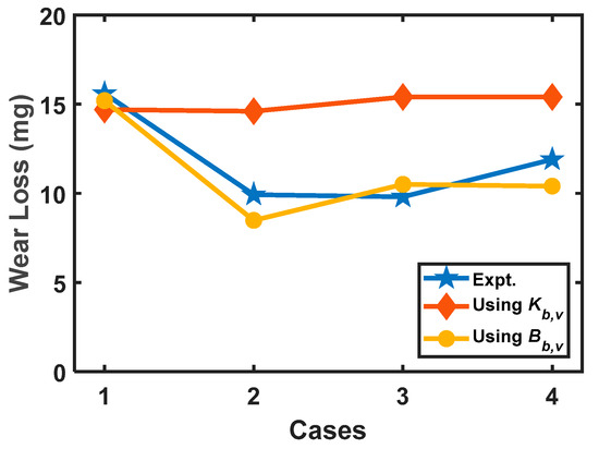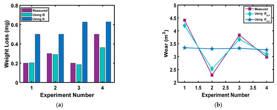 What follows next is that for different experimental data provided in Aghdam and Khonsari [123], the values of the Archard wear coefficient Ku,u and the degradation coefficient Bu,u are determined using Equation (26a,b) and plotted in Figure 9b. The suffix “u,u” represents unidirectional sliding with uniform operating conditions. From this figure, it can be inferred that Bu,u has a lower variation for different operating conditions than the values of Ku,u.