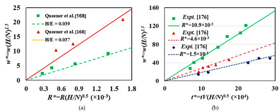 To validate Equation (6), Huq and Celis [92] performed ball-on-disk experiments at the ambient condition of 50% relative humidity (RH) for different loads under a fixed sliding speed for TiN-alumina pair. They reported a linear fit of volumetric loss and energy dissipation (see Figure 3a) with an R2 value of 0.96. The plot is obtained from the curve-fit equation provided in [92].