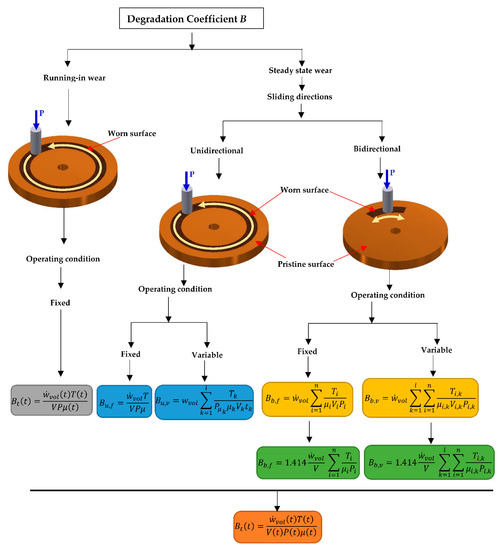 Subsequently, during the running-in period, the wear rate changes with time (see Figure 4a). Thus, the degradation coefficient must be a function of time, i.e., B = Bt(t), as represented in Equation (20). Suffix t represents the transient wear condition.