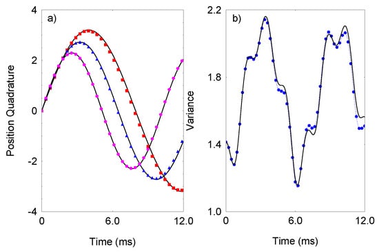 (Color online) (a) Time-evolution of the position quadrature . We compare the exact result of the time-dependent Schrödinger equation with Hamiltonian (2) with the analytical expression (8) (solid lines) for (purple circles), (blue triangles), and (red squares). The other parameters are set to , kHz, and MHz. (b) Variance of the position quadrature. The exact result (blue circles) is compared with the analytical expression (8) (solid line) for .