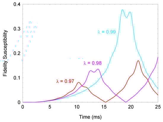 Measuring the position quadrature , one can estimate, for example, the bosonic frequency . In order to quantify the sensitivity in the frequency estimation, we use fidelity susceptibility [1]. The shot-noise limited sensitivity in the estimation of from the measured signal is . In Figure 2, we plot the fidelity susceptibility as a function of time for different couplings . As increases toward the critical coupling , the sensitivity in the frequency estimation is improved. Indeed, using (8), it is straightforward to show that, at time and approaching , we have and, respectively, . Therefore, minimizing the position variance, the uncertainty in the boson frequency estimation scales as , which implies that arbitrarily large frequency estimation precision can be achieved close to the criticality.