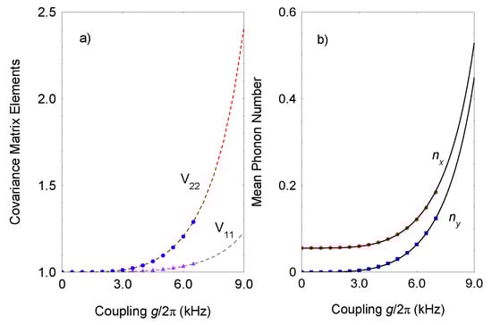 In Figure 3a, the numerical result is shown for the covariance elements and as a function of the coupling strength . In the steady state regime, the matrix elements are given by