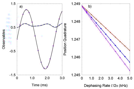 Let us now discuss the effect of the spin dephasing on the steady state. Such a decoherence effect can be described by including a spin dephasing term in Equation (4) with the jump operator . Here, stands for the constant dephasing rate, and is the decoherence time. Since the periodic drives creates a spin-dependent coupling between the bosonic modes, one can expect that the spin decoherence would decrease the estimation precision. Remarkably, because the high-frequency drive causes a spin-dependent bosonic interaction, and the dissipative dynamics are time-independent, the resulting effective Liouvillian is diagonal in the spin basis such that the JT system becomes immune against the spin dephasing. We emphasize that the spin noisy decoupling is intimately related with the strong periodic drive in the JT system. We observe that, even in the presence of spin dephasing, the steady state numerical result for the average bosonic excitation in Figure 3b closely follow the analytical expression (11). In Figure 4a, the time evolution of the position quadrature and the mean boson number is shown, including the spin decoherence term in Equation (4), for . Usually, the effect of the spin dephasing is to compromise the signal contrast. As we see, the high-frequency drive protects the signal contrast against spin dephasing. In Figure 4b, the position quadrature is plotted as a function of the dephasing rate for different frequencies and constant coupling . We observe that, by increasing and keeping fixed, one can further suppress the effect of the spin dephasing. This result indicates the periodic modulating JT system can serve as a probe for enhanced parameter estimation with measurement time not limited by spin dephasing.