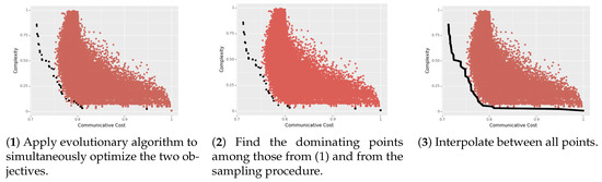 The overall Pareto frontier estimation algorithm, in three steps. Each red point is one artificial language sampled according to an independent procedure. The black points in panel (3) constitute the final estimate of the true Pareto frontier.