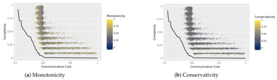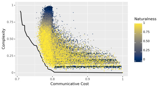 The main results can be seen in Figure 2. In this figure, the x-axis is communicative cost, which is , and the y-axis is complexity, where both and complexity are as defined in Section 3.1. Each point represents a possible language, with the color of a point corresponding to degree of naturalness. The black line is the estimated Pareto frontier, i.e., the set of languages that optimally trade-off between these two factors.