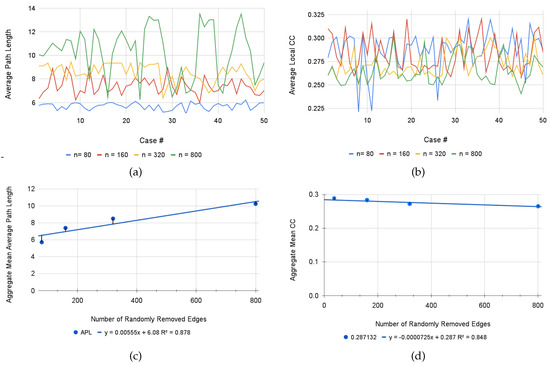 A visual display of both the variability of all fifty iterations for each value of n and the APL and CC metrics in (a,b), as well as a regression for the mean APL and CC across all iterations in (c,d).