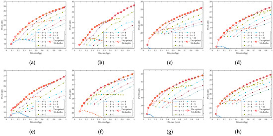 The optimal bit-depths of eight images for CS-based coding system with uniform SQ. (a) Monarch; (b) Parrots; (c) Barbara; (d) Boats; (e) Cameraman; (f) Foreman; (g) House; (h) Lena.