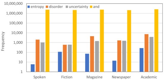 Frequency of appearances of the words entropy, disorder and uncertainty in the Corpus of Contemporary American English. The common and neutral word “and” was added as a proxy guide to the relative frequencies of the five indicated genres, which appear to be very close to each other. Data from [,].