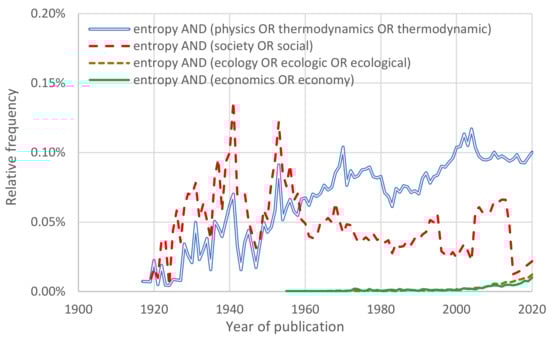 The academic corpus can be investigated using bibliometric databases, such as Scopus []. The results obtained from several searches in the latter are shown in Figure 2. One would expect that the term “entropy” would more frequently appear in scholarly articles in combination with terms such as “physics” or “thermodynamics”—and indeed this is the case for recent years. Amazingly, however, before the 1960s, the combination of the term “entropy” with “society” or “social” was more frequent than the former. This suggests the appeal of a concept related to the Second Law of thermodynamics in social sciences. We note that in that period, the probabilistic content of entropy (see Section 2) was not fully developed, and thus, in papers before the 1960s, entropy was used with its classical thermodynamic meaning (also explained in Section 2). Specifically, the resource flow in economics was parallelized with the energy flow in thermodynamics. As seen in the figure, in the 21st century, “entropy” is also used in combination with ecology and economics.