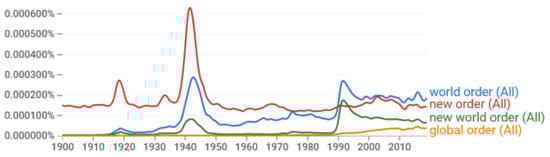 Frequency of appearance of the indicated phrases in Google Books [,]. Notice that the “new order” was the political order that Nazi Germany wanted to impose, and naturally its use peaked in the early 1940s. The other phrases also peaked at the same time, but they show higher peaks after 1990s.