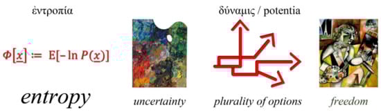 An attempt at an artistic representation of the notion of entropy. Uncertainty is depicted by Marc Chagall’s Palette (adapted from []) and freedom by Marc Chagall’s Self-Portrait with Seven Fingers []; δύναμις (Greek) or potentia (Latin) is the Aristotelian idea of potency or potentiality.