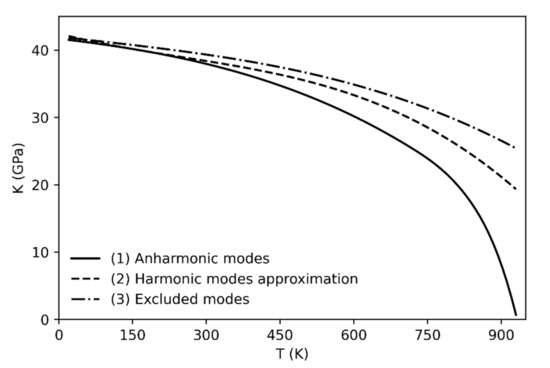 The determination of the bulk modulus by using Equation (2) has been carried out in three ways (always accounting for the phonon dispersion): (1) by including the anharmonicity correction, (2) within the harmonic approximation and (3) by excluding the three anharmonic modes (see Figure 2). The anharmonic correction (1) reproduces the experimental trend of the bulk modulus as a function of temperature [8]. Indeed, the bulk modulus values drop towards zero as the phase transition is approached.