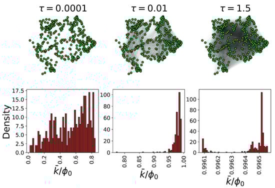 It is worth noting that, in the limit of the very small temporal scale, the propagator can be linearized as , where is the identity matrix, and the functional network adjacency reduces to the adjacency matrix , encoding local interactions between the nodes, while excluding self-loops. For clarity, a visualization of the emergent functional state corresponding to four synthetic networks is visualized in Figure 1. Moreover, for the emergent functional state , we represent the strength of node i using small letter . The strength distribution depends on the temporal scale of interactions (see Figure 2).