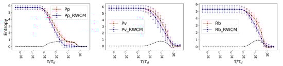 Entropy analysis. The average Von Neumann entropy for Physarum polycephalum (Pp), Phanerochaete velutina (Pv), and Resinicium bicolor (Rb) are shown as red lines. Their corresponding null models RWCM are plotted as blue lines. The Von Neumann entropy of the original networks and RWCM are indistinguishable when extremely small and large temporal scales are considered, while at the middle scales the Von Neumann entropy of original networks is often higher than the corresponding RWCM. The black dashed lines show the difference, to highlight the advantage of the real complex topology in keeping the functional diversity high.