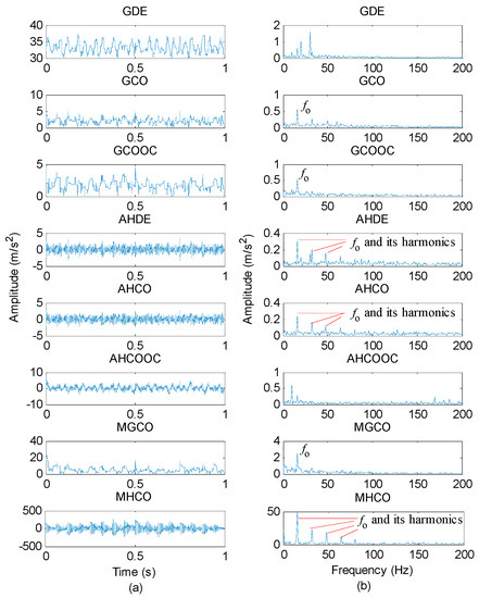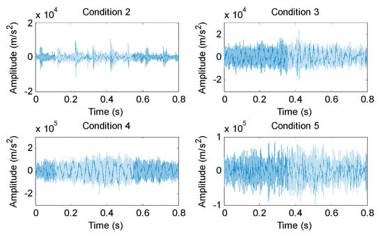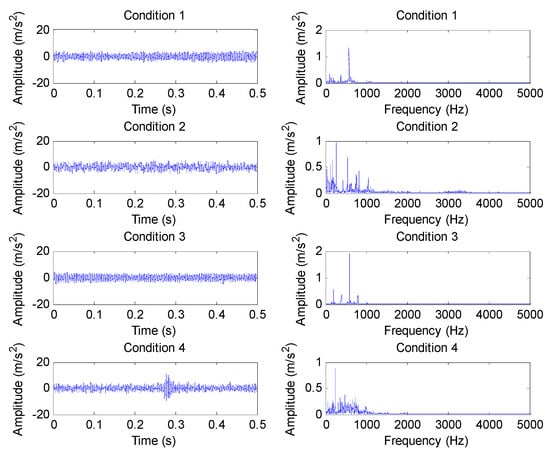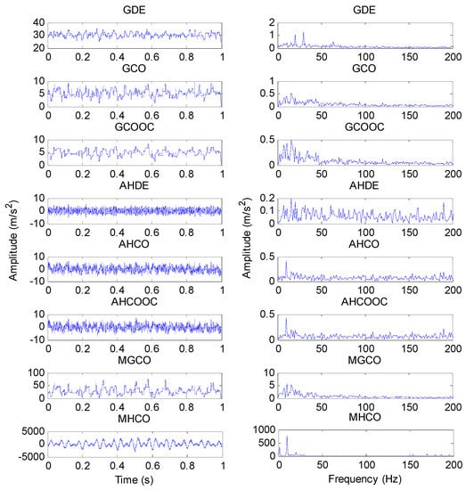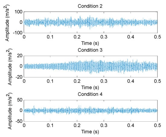 Figure 21, gear fault conditions are difficult to be identified directly through observing the time domain waveform and amplitude spectrum, because different gear vibration data have certain self-similarity. Therefore, it is necessary to adopt an effective method to process the practical gearbox data.