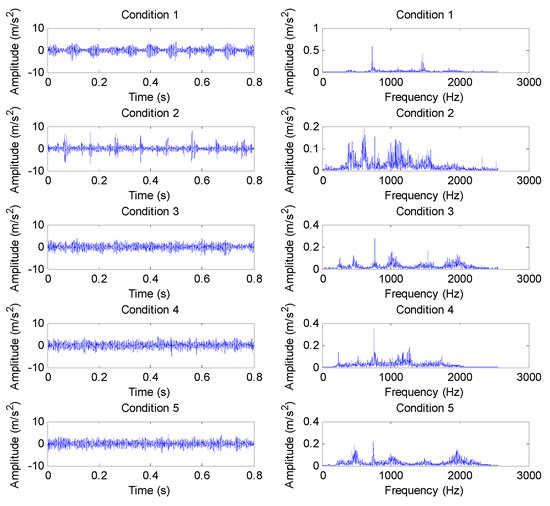 Table 2 details the gear health conditions and sample selection. The time domain waveforms and amplitude spectra of gear vibration signals under different health conditions are shown in