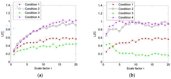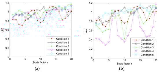Figure 16a,b show the GCMLZC of one data sample for different gear health conditions before and after morphological convolution filtering, respectively. In the GCMLZC method, without a loss of generality, the largest scale factor