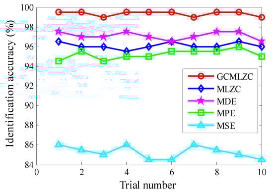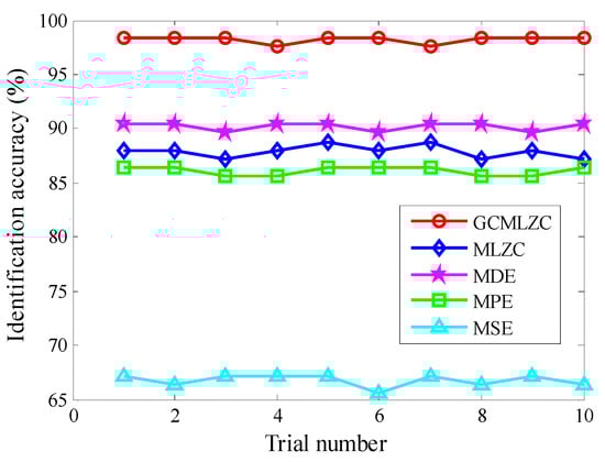 Similarly to case 1, to further prove the effectiveness of the proposed method, the identification abilities of five methods (i.e., GCMLZC, MLZC, MDE, MPE and MSE) were compared. Similarly, 10 trials of different methods were conducted to ensure the fairness of the comparison results. In addition, in all comparison methods (i.e., GCMLZC, MLZC, MDE, MPE and MSE), without a loss of generality, the largest scale factor