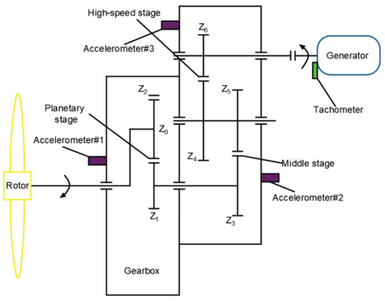 Figure 19) glued onto the casing of the gearbox with a sampling frequency of 32,768 Hz. The wind turbine gearbox operated under four gear health conditions (i.e., normal, pitting fault of small gear in middle stage, spalling fault of big gear in high-speed stage, fracture and wear compound fault small gear in high-speed stage). When gear vibration data collection was conducted for each health condition, the wind speed was stable at about 12 m/s (corresponding to an input shaft speed of about 17 rpm and a power of about 1500 kW), and the speed of the high-speed shaft was stable at about 1400 rpm. Thus, the rotating frequencies of the high-speed shaft and middle shaft can be approximatively calculated as