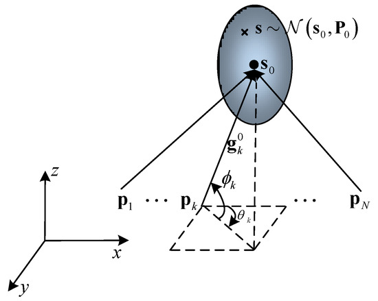 We consider a 3D AOA configuration with N sensors localizing a stationary target, as depicted in Figure 1, and each sensor is assumed to be omnidirectional. is the unknown location of the target with denoting matrix transpose, is the location of the sensors. It is assumed that is a Gaussian random variable with a distribution as , where and represent the mean and the covariance matrix of . Note that the gray ellipse in Figure 1 illustrates the confidence region corresponding to the Gaussian priors, and denotes the bearing measurement with the azimuth and elevation angle in spherical coordinates. Using as a reference, the AOA measurement of the kth sensor can be expressed as