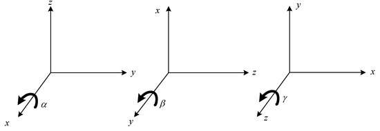 Here , , and are counterclockwise rotation angles around the x, y, and z axes, respectively, which is depicted in Figure 2. The rotation matrix is