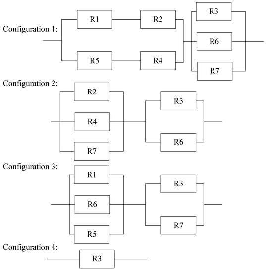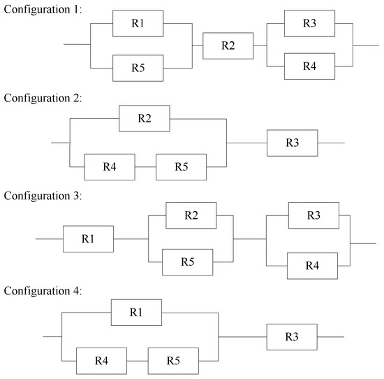 Substituting the optimal angle into (39), we can obtain different configurations, as listed in Table 1. We set , , , , and , then adopt the resistor network model to find the minimum , which depends on the prior covariance matrices, the angle noise variances and , and the sensor-target ranges r. The resistor network model for optimal sensor placement with different configurations is shown in Figure 3.