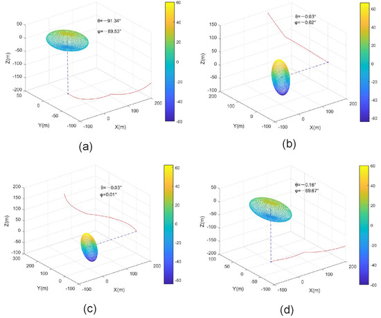 Case D: We used the parameters of Case B except , and after the 3D rotation. As in Case C, the final angles were and , which matches Configuration 4 () in Table 1; and the LOS was orthogonal to the largest eigenvector of , and the sensor trajectory is shown in Figure 5d.