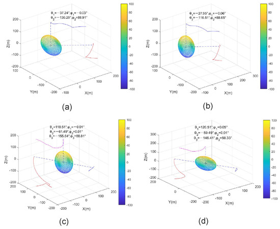 Similarly, we used the same parameters except for the covariance matrix in Cases C and D. The non-diagonal covariance matrix in Case D was diagonalized by the 3D rotation. It is shown that the sensor trajectories and the final optimal sensor-target geometries were almost identical in Figure 6c,d, which also satisfies the results of Section 4.3.