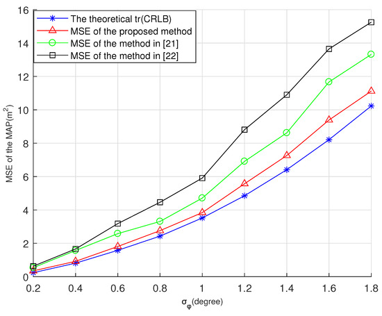 The theoretical trace of CRLBs and MSEs of different sensor placements are shown in Figure 7. The MSEs of MAP were estimated using 10,000 Monte Carlo simulations. The MAP estimator was implemented using the Gauss–Newton method and initialized to the prior mean target location . The results showed that the optimal sensor placement can always provide better MSEs than the other existing methods.