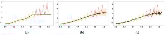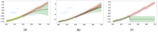 Consequently, in the limit when the conditional covariance in is small compared with the length scale , Equation (19) indicates that the effective kernel is the SE kernel with a deterministic input , which is equivalent to the deep kernel with SE as the base kernel (see Equation (5) in [16]). On the other hand, when and are comparable, the terms within the first bracket in the RHS of Equation (19) are a non-stationary function which may attribute multiple frequencies in the function f. The deep kernel with the spectral mixture kernel (Equation (6) in [16]) as the base is similar to the effective kernel.
