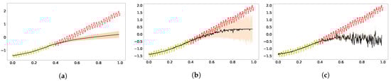 Extrapolation of the standardized airline data using DKL (a), 2-layer DGP (b) and 3-layer DGP (c). (a) DKL; (b) Two-layer DGP; (c) Three-layer DGP.