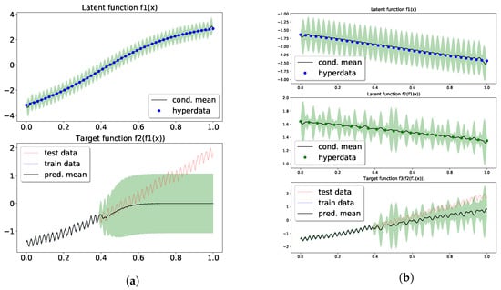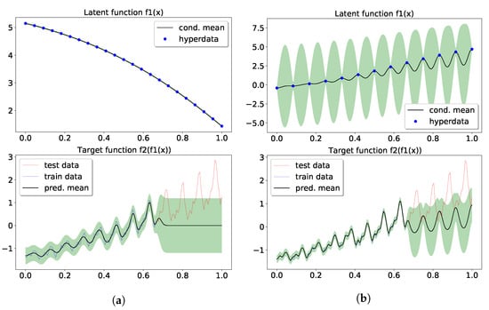 The learning of all hyperparameter data follows the standard gradient descent used in GPy [48], and the gradient components include the usual ones, such as in exposed layer and those related to the intermediate layer and the hyperdata through chaining with and via Equations (3) and (4). To exploit the expressive power of neural network during optimization, the hyperdata can be further modeled by a neural network; i.e.,