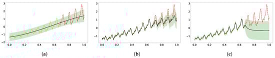 Our two-layer model, aided by the probabilistic latent layer supported by 13 hyperdata, showed improved extrapolation along with the high-frequency signal in prediction and confidence. The optimal logML was 28.5, along with the learned , and noise level . As shown in Figure 6b, the latent function supported by learned hyperdata shows an increasing trend on top of an oscillating pattern, which led to the periodic extrapolation in the predictive distribution, albeit only the vanilla kernels were used. It is interesting to compare Figure 6b with Figure 6a, as the latter model had 23 hyperdata supporting the latent function, and the vanishing uncertainty learned in the latent function produced an extrapolation that collapsed to zero. The logML in Figure 6a is 7.25 with learned , , and noise level .