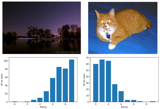 Information on aesthetic quality is often found on professional photography sites such as DPChallenge or Photo.net, where different photographic challenges are proposed based on a theme and users upload and evaluate different photographs. However, these pages only offer information about the number of votes, not the user that rates the image. Figure 1 shows two images of DPChallenge with the different ratings received in the range [1–10]. Each vote in the high values represents a user’s belief that the photo has a high quality, while a vote in the lower values represents a belief that the image is of poor quality.