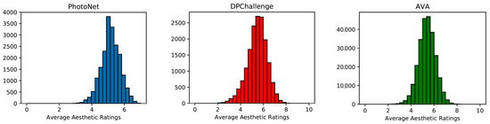 Diverse databases have been generated from these sources for the problem of aesthetic quality. Table 1 shows the three most broadly used datasets among them. The number of images they contain is also indicated, as well as the information of the ranges in which the images have been evaluated. In Figure 2, we see the vote distribution of the images of each of the databases, where in all cases, we see a clear normal distribution with the average close to five.