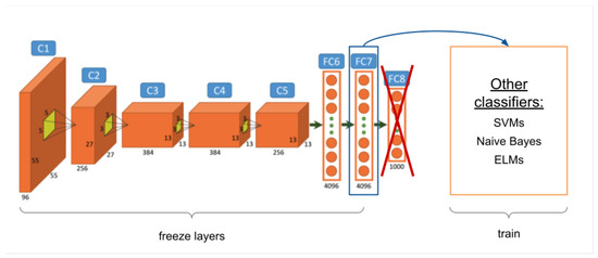 Therefore, in all the experiments of this section, the next-to-last layer weights of the network were extracted, as can be seen in Table 3. This table shows the number of characteristics obtained in each case. Models learned from these characteristics are binary classifiers, such as: the SVMs, widely used in image processing; naive Bayes, with continuous variables modeled as Gaussian conditional distributions; and extreme learning machines (ELMs) [38], algorithms based on neural networks that have proven their effectiveness in many problems.