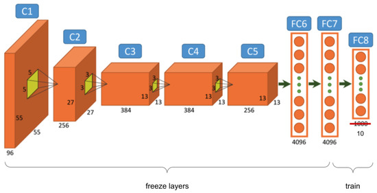 Fine-tuning is a technique of transfer learning, which consists of adapting the structure to the task and retraining the changed connections of the network with the available data. It is possible to fine-tune the rest of the layers of the ConvNet or to keep some of the first ones frozen. In Figure 4, we can see an example of fine-tuning, where all the layers are frozen except FC8, which was modified for a 10-class problem, and their weights were reset. Only this last layer was trained with fine-tuning.