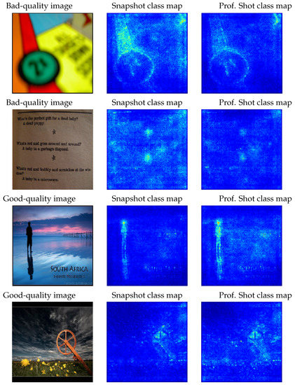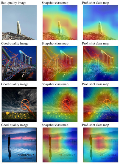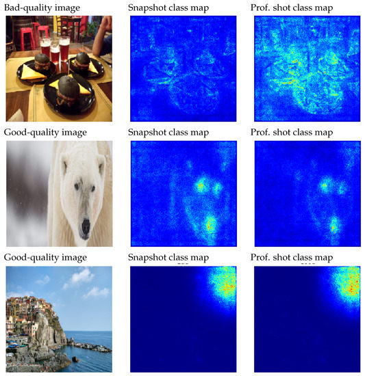 Figure 7 shows some images with a distinct quality level. Those heat maps with more intensity correspond to good quality. Furthermore, it is interesting to analyze those areas that present various intensity levels. This indicates that certain areas within the image present simultaneously features of good and bad quality. For instance, it could happen that the main element of the image is correctly focused and the color composition is correct, but the element is not satisfactorily located in the image. However, the different sources (reasons) for detecting the good/bad areas cannot be perceived just with the given information. We need to remark that only the areas that contribute positively are shown with this technique. This implies that those elements that contribute only negatively to a class and do not contribute positively to the other one will not be shown.