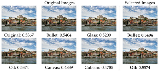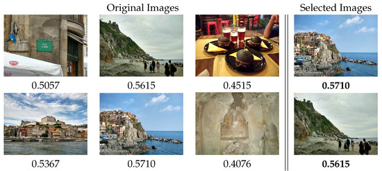 Finally, an image modification tool (in this case, GIMP (https://docs.gimp.org/2.10/es/filters.html, accessed on 19 October 2021) was used to generate a set of images with different filters from a single picture. Afterwards, Aesthetic Selector just kept those modified images that had improved aesthetic quality. With this, the application can be used as an intelligent selector of filters, able to select those modifications that improve the attractiveness of an image, as we can see in Figure 10.