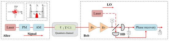 In this section, we introduce the LLO-CVQKD scheme by using heralded HLA. As shown in Figure 1, Alice randomly chooses two Gaussian random variables (with a mean of zero and a variance of ), generates a coherent state to modulate the continuous waves emitted by the laser [40,41]. An arbitrary phase rotation is generated by a quantum channel to change the states. To restore the original signal, a relatively strong phase reference pulse is alternately sent with the quantum signal. The beam then passes through the optical channel. At Bob’s side, a heralded HLA is placed in the signal beam to improve system performance. Besides, Bob performs optical heterodyne detection to measure quadrature x and p.