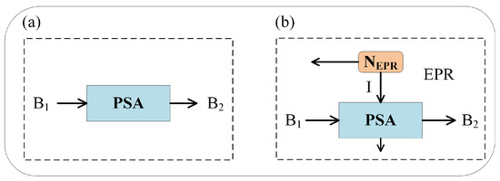 PIA is a non-degenerate optical parametric amplifier whose structure is shown in Figure 2b. It consists of a noiseless amplifier and a two-mode squeezed vacuum (EPR) state of variance , which is used to simulate the inherent noise of the amplifier. The output of PIA is written as