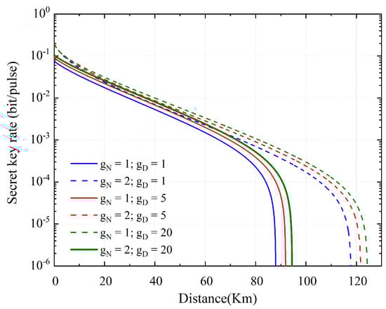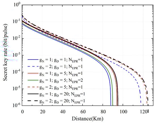 The secret key rate as a function of transmission distance based on PSA. Blue line, red line, and green line correspond, respectively, to a value of the amplifier coefficient of (initial), = 5, and = 20. Full lines and dashed lines correspond to two cases where the number of links is 1 and 2, respectively.