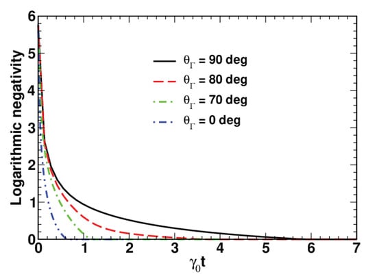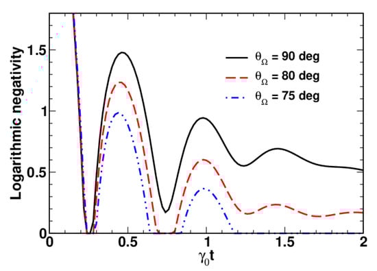 The curves plotted in Figure 3 are computed at different values of the angle that specify the orientation of the frequency vector with and illustrate the effect of the dynamical intermode coupling on entanglement dynamics. It is seen that oscillatory behaviour of the logarithmic negativity at translates into sudden revivals of entanglement as the angle decreases.