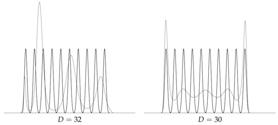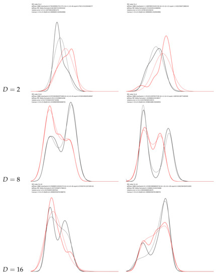For example, Figure 2 displays the unnormalized PEDs obtained for two Gaussian mixture models ( components and components) into PEDs of a PEF of order . The MC estimation of the JD with samples yields , while the PED approximation of Equation (8) on corresponding PEFs yields (the relative error is or about ). It took about milliseconds (with on a Dell Inspiron 7472 laptop) to MC estimate the JD, while it took about milliseconds with the PEF approximation. Thus, we obtained a speed-up factor of about 3190 (three orders of magnitude) for this particular example. Notice that when viewing Figure 2, we tend to visually evaluate the dissimilarity using the total variation distance (a metric distance):