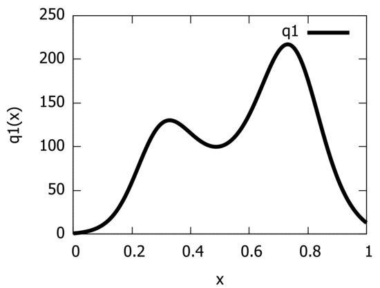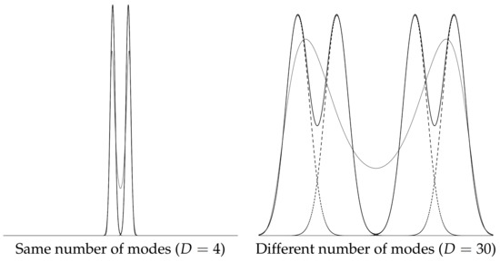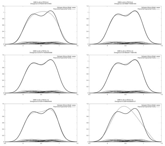 We shall consider polynomial exponential families [28] (PEFs) also called exponential-polynomial families (EPFs) [29]. PEFs are regular minimal exponential families with polynomial sufficient statistics for . For example, the exponential distributions form a PEF with , and , and the normal distributions form an EPF with , and , etc. Although the log-normalizer can be obtained in closed-form for lower order PEFs (e.g., or ) or very special subfamilies (e.g., when and , exponential-monomial families [30]), a no-closed form formula is available for of EPFs in general as soon [31,32], and the cumulant function is said to be computationally intractable. Notice that when , the leading coefficient is negative for even integer order D. EPFs are attractive because these families can universally model any smooth multimodal distribution [28] and require fewer parameters in comparison to GMMs: Indeed, a univariate k-GMM (at most k modes and antimodes) requires parameters to specify (or for a KDE with constant kernel width or for a KDE with varying kernel widths, but then observations). A density of an EPF of order D is called an exponential-polynomial density (EPD) and requires D parameters to specify , with, at most, modes (and antimodes). The case of the quartic (polynomial) exponential densities () has been extensively investigated in [31,33,34,35,36,37]. Armstrong and Brigo [38] discussed order-6 PEDs, and Efron and Hastie reported and order-7 PEF in their textbook (see Figure 5.7 of [39]). Figure 1 displays two examples of converting a GMM into a pair of dually parameterized exponential-polynomial densities.