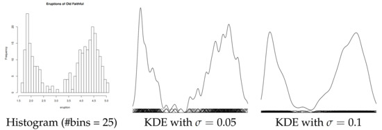 Modeling the Old Faithful geyser by a KDE (GMM with components, uniform weights ): Histogram (#bins = 25) (left), KDE with (middle), and KDE with with less spurious bumps (right).